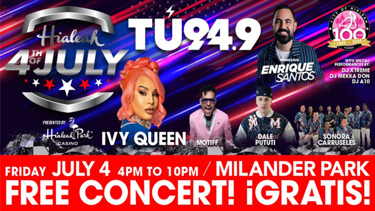 Este 4 de Julio, ¡Hialeah se prende en fiesta! La Ciudad de Hialeah te invita a celebrar a lo grande en Milander Park con un evento totalmente gratis y para toda la familia. Prepárate para una noche llena de ritmo, sabor y pura alegría con presentaciones en vivo de Ivy Queen, Sonora Carruseles, Dale Pututi, Motiff, DJ Mekka Don y DJ Xtreme, todo bajo la animación explosiva de Enrique Santos. Habrá comida deliciosa de camiones locales, una zona infantil repleta de diversión y un espectáculo de fuegos artificiales que iluminará el cielo como nunca antes. No te pierdas esta fiesta patriótica al estilo único de Hialeah: ven a gozar, bailar y celebrar como solo nosotros sabemos hacerlo.