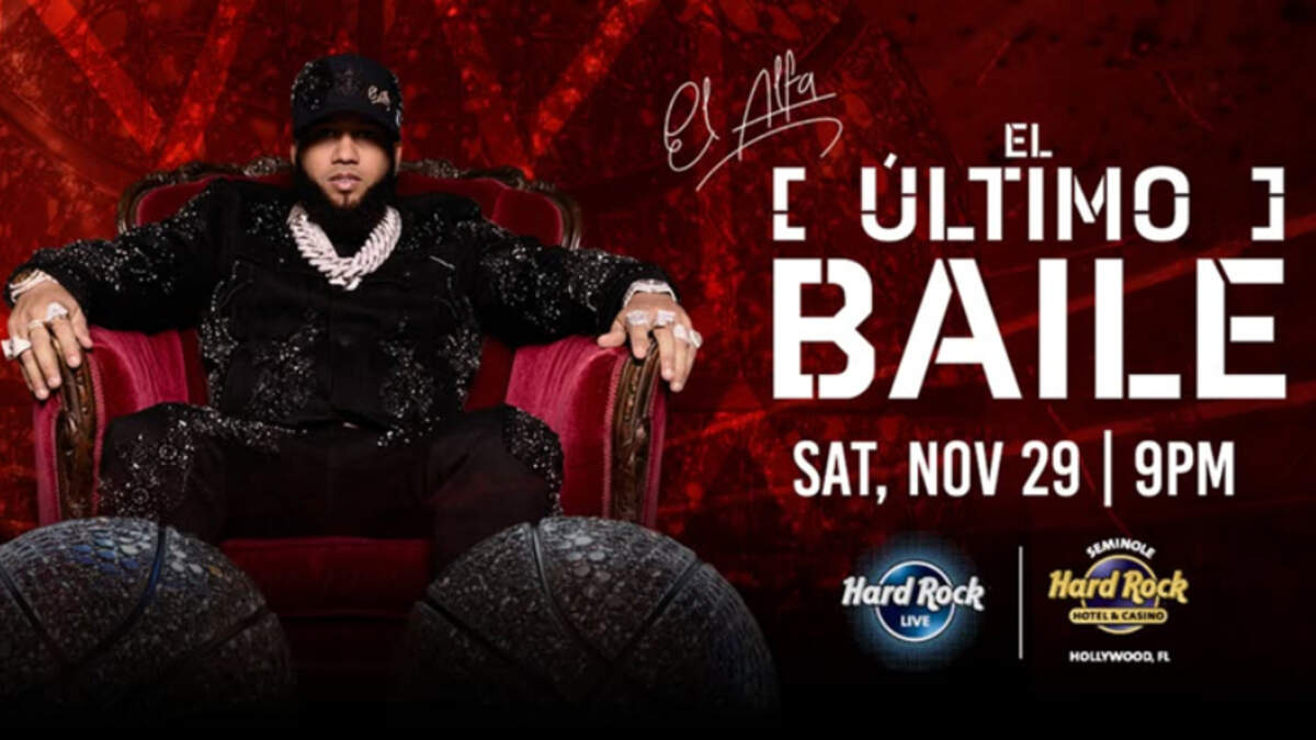 Prepárate para una noche inolvidable cuando El Alfa, el ícono del dembow dominicano, traiga su electrizante gira El Último Baile Tour al escenario de Hard Rock Live, ubicado dentro del Seminole Hard Rock Hotel & Casino en Hollywood, Florida. El evento se llevará a cabo el sábado 29 de noviembre, prometiendo una experiencia llena de ritmo, energía y los éxitos que han convertido a El Alfa en una figura internacional. ¡No te lo pierdas!