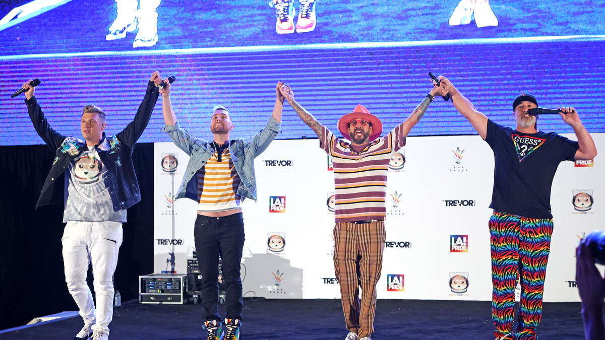 LOS ANGELES, CALIFORNIA - JUNE 18: (L-R) Nick Carter of Backstreet Boys, Joey Fatone and Lance Bass of NSYNC, and AJ McLean of Backstreet Boys perform onstage at "Bingo Under The Stars" in celebration of Pride, hosted by members of NSYNC and Backstreet Boys at The Grove on June 18, 2021 in Los Angeles, California. (Photo by Kevin Winter/Getty Images)Foto: Getty Images